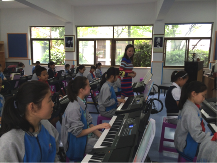 本次授課的是,雅馬哈派遣的專業音樂老師。因為新老師的到來,同學們多少顯得有些拘謹,但老師用一系列動畫片的歌曲串燒,如名偵探柯南,天空之城,藍精靈……這些歌曲一下子將同學們吸引到了音樂的世界。