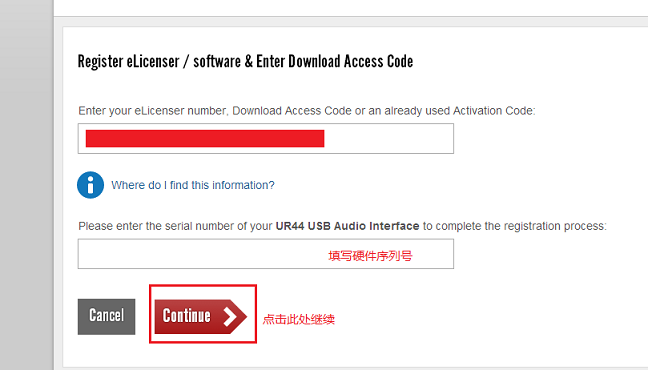 10. 填寫下載信息說明(Cubase AI Download Information) 上的下載許可碼(Downlad access code):