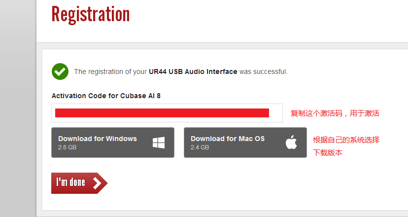 12. 此時,會出現一個激活碼和Cubase AI 8的下載鏈接: