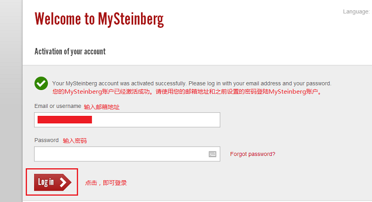 8. 這時會跳轉至MySteinberg登錄界面,并提示賬戶激活成功: