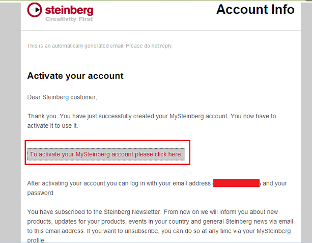 7. 進入您的郵箱賬戶,查看來自Steinberg的郵件,點擊中間的“To active your MySteinberg account,please click here.”: