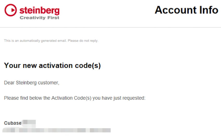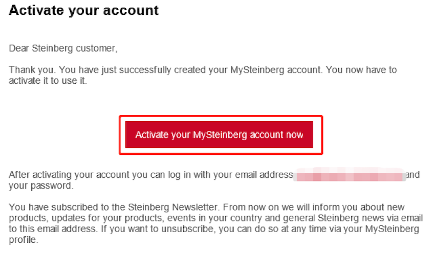 11. 激活碼也將發送至您登錄MySteinberg賬戶所用的郵箱中