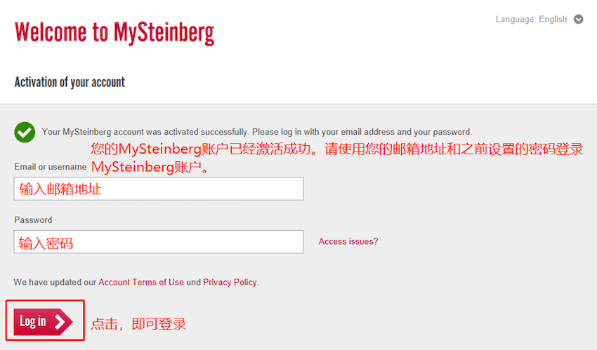 6. 這時會跳轉至 MySteinberg 登錄界面,并提示賬戶激活成功: