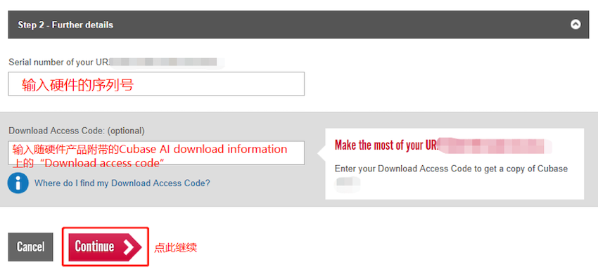 8. 填寫下載信息說明(Cubase AI Download Information)上的下載許可碼(Download access code)