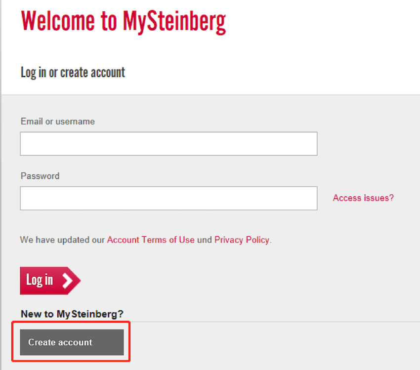2. 進入: https://www.steinberg.net/en/home.html,點擊“MySteinberg”,創建“MySteinberg”賬戶,點擊“Create account”(創建賬戶)
