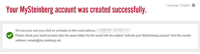 4. 成功創建MySteinberg賬號,并提示到您之前填寫的郵箱中查看Steinberg發送的郵件,以激活您的Steinberg賬號。