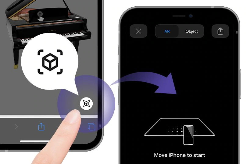 您不僅可以通過增強現實想象鋼琴,還可以點擊 3D 鋼琴模型來聆聽它的聲音。
