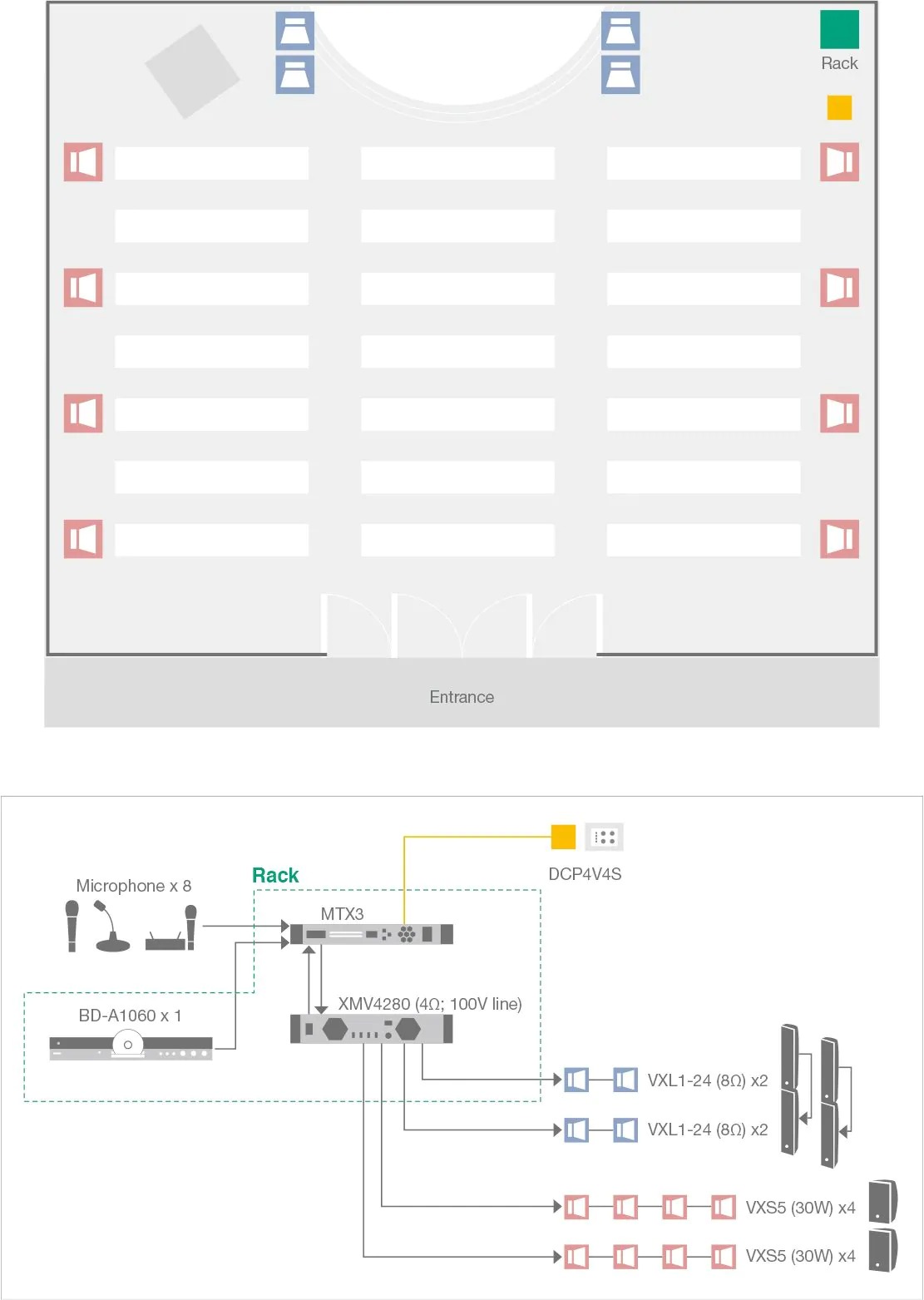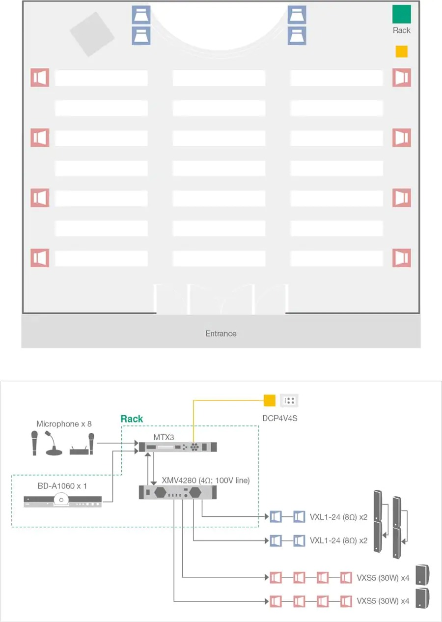 此類需求通常出現在教堂或教育設施中。在此類環境中,無論出于聽覺還是視覺因素,VXL系列線陣音箱都是主前音箱的不二之選,在混響較大的空間中,VXL系列也能夠帶來清晰優質的聲音。在本例中,每兩個VXL音箱垂直連接,增加了聲壓級并擴大投射范圍,確保后排觀眾亦能聽清聲音。在房間左右兩側放置VXS5音箱,可最大限度擴展覆蓋范圍,消除盲點。此設置能夠為在場的每個人提供清晰的聲音。MTX矩陣處理器包含的反饋抑制器功能在此類應用中非常實用。可通過單個旋鈕調出使用MTX-MRX Editor預先編入的適當設置,從而對中央控制進行直接設置。通過DCP控制面板可以方便地進行日常音量調節,無需操作MTX處理器。