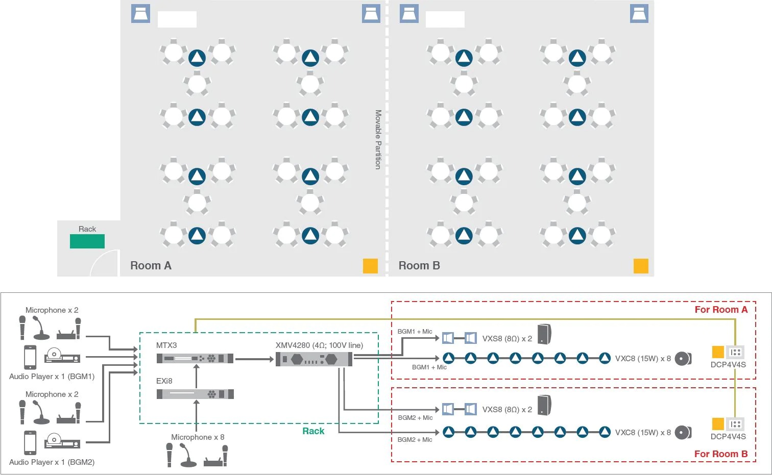 這是一個頗為常見的酒店宴會廳或多用途大廳,下列系統能夠為此應用提供有效支持。系統示例中的房間A和房間B通常會分開用于會議、派對或其他活動,因此這些房間需具備獨立操作的音頻系統。雅馬哈MTX3是一款便捷的矩陣處理器,能夠從多個聲音源和話筒接收音頻輸入,并將音頻分配至指定音箱系統。當需要增加話筒輸入的數量時,您可以用EXi8來實現。安裝在不同區域的DCP4V4S控制面板支持遠程控制話筒音量和開關,也可以根據需要靈活地在MTX-MRX Editor軟件中進行設置。當間隔物被移開、各房間打通為一個大空間時,可通過單個旋鈕調出使用MTX-MRX Editor預先編入的適當設置,從而對中央控制進行直接設置。