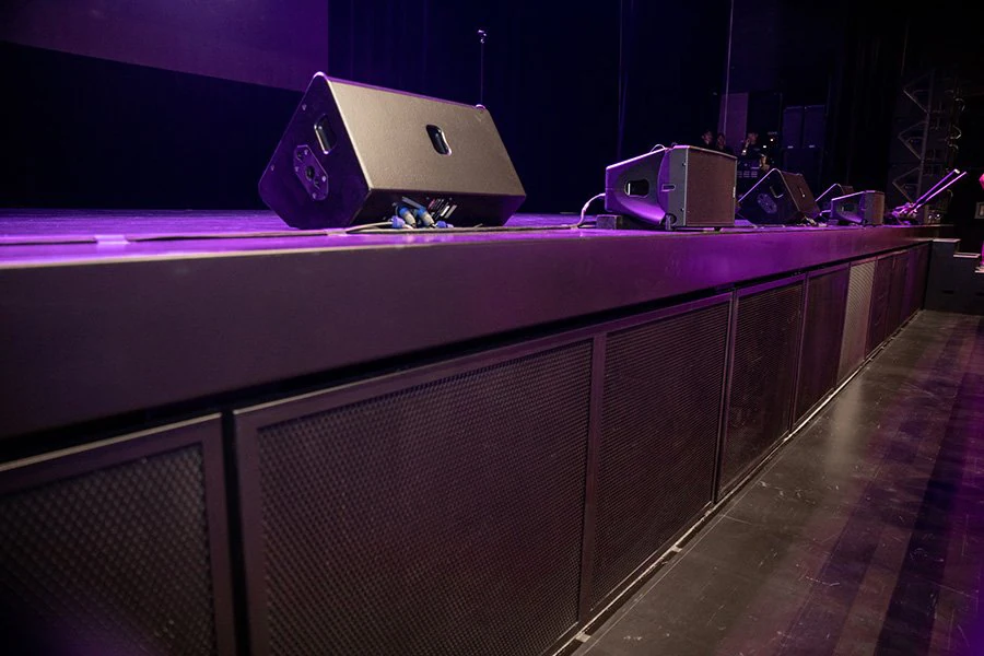 該系統(tǒng)被設(shè)計(jì)為高效率、高能量,讓場(chǎng)地能作為搖滾音樂的會(huì)場(chǎng),它由每側(cè)7個(gè)STM M46主模塊和7個(gè)STM B112低音單元組成,懸掛在兩層。兩串主陣列下方各添加了一個(gè)STM M28通用模塊,以提供向下填充,并且在舞臺(tái)前方放置18個(gè)STM S118超低音音箱陣列,以確保均勻的低頻覆蓋。P12和PS15用于舞臺(tái)監(jiān)聽。該系統(tǒng)由21臺(tái)NEXO NXAMP4x4 4通道有源TD控制器驅(qū)動(dòng),控制器配有NXDT104 Mk2 Dante音頻網(wǎng)卡,提供總共84軌功放通道。側(cè)面音箱包括4個(gè)NEXO GEO S1210音箱和4個(gè)LS18超低音音箱,以及4個(gè)用于前方聲場(chǎng)的GEO M1012。