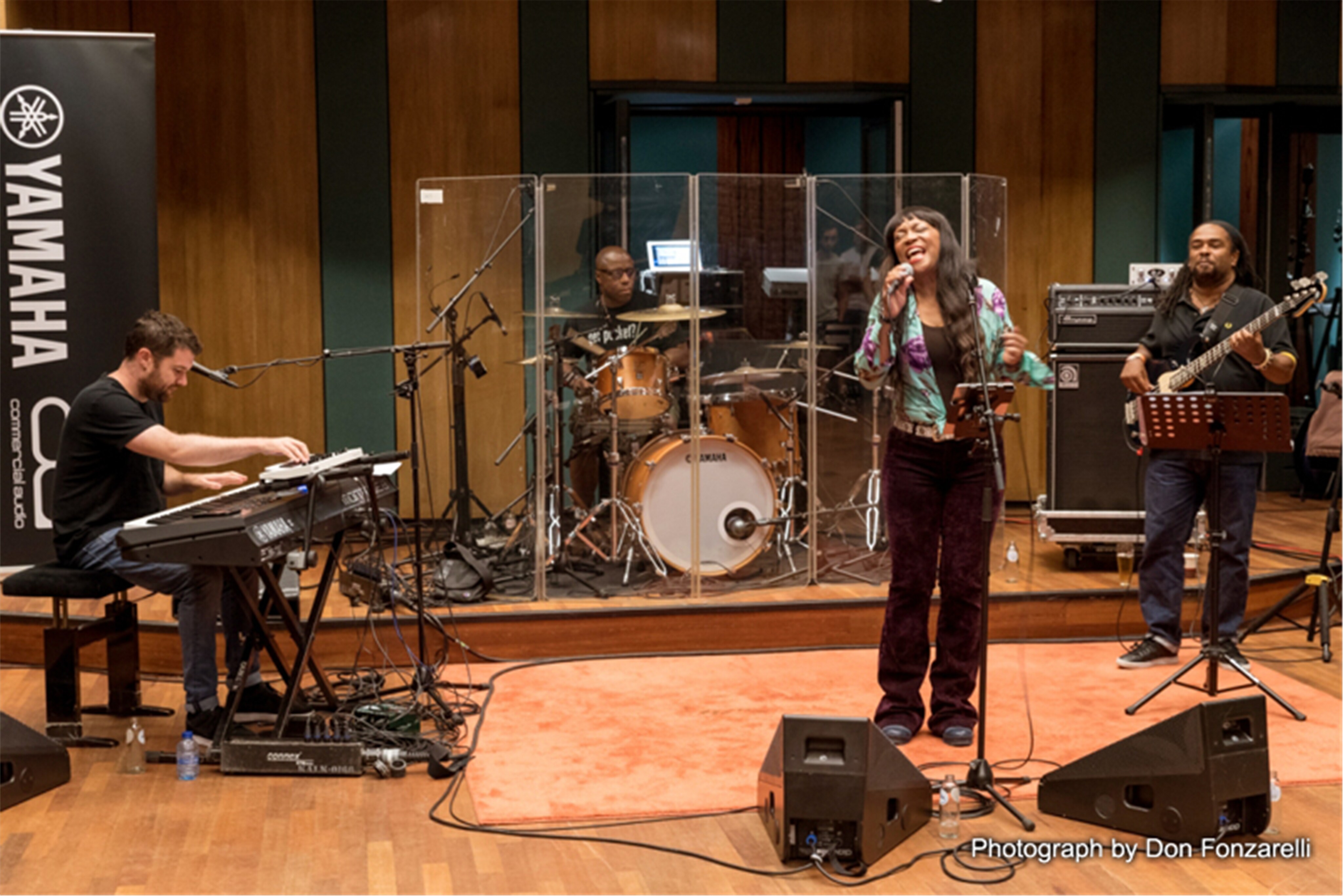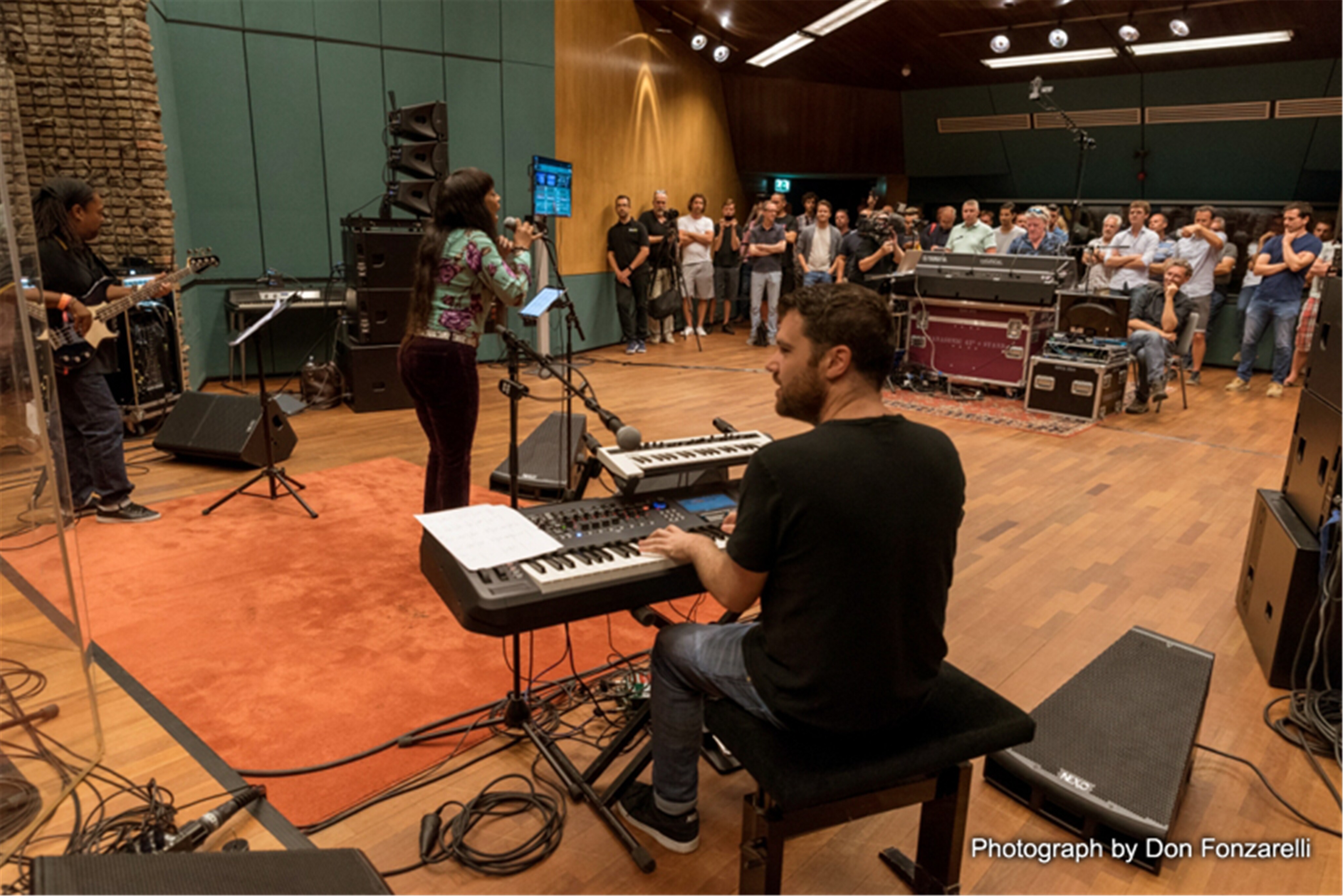 之后,所有人都被邀請進入1號錄音室,RIVAGE PM10系統、Jamiroquai樂隊的FOH工程師Rick Pope以及來自樂隊的四位音樂家——Derrick McKenzie(鼓手)、Ernie McKone(貝斯手)、Nathan Williams(鍵盤手)和Hazel Fernandes(主唱)已經靜候多時了。Rick在RIVAGE PM10上通過Nexo M10 PA系統和45N12監聽進行混音,Jamiroquai樂隊為大家表演了許多歌曲。