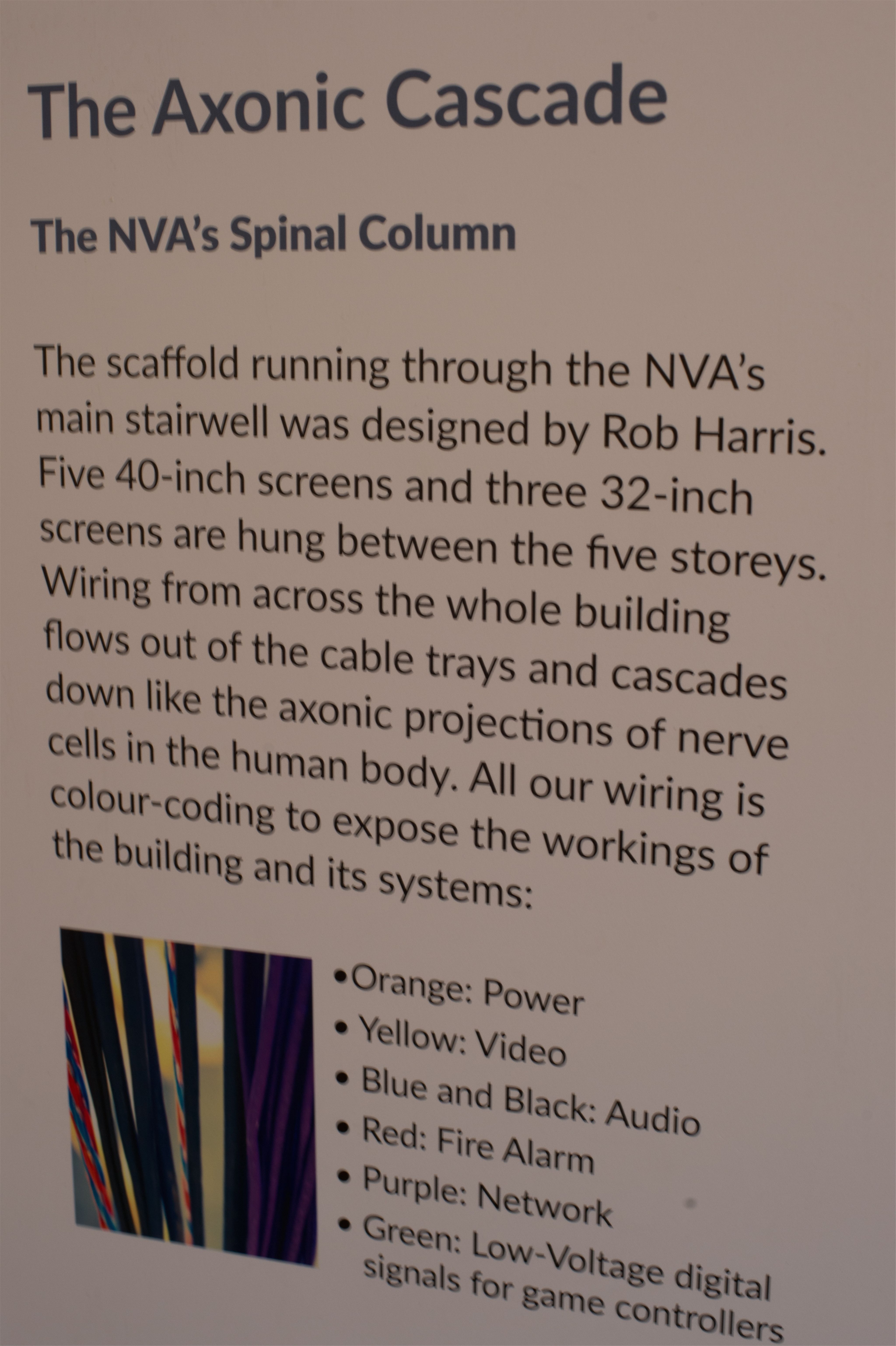 盡管所有系統(tǒng)的DSP和布線都是在后臺完成的,但NVA的教育職責(zé)意味著所有的技術(shù)設(shè)施和布線都被有意地布置在外。被稱為“軸突級聯(lián)”的布線因其不同的用途而采用顏色編碼,我們鼓勵參觀者觀察這些連線,仿佛就像通向人體神經(jīng)的路線一樣。
