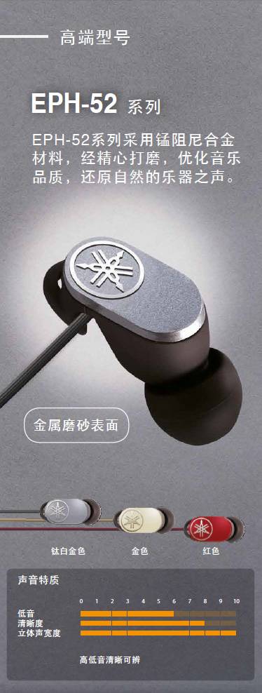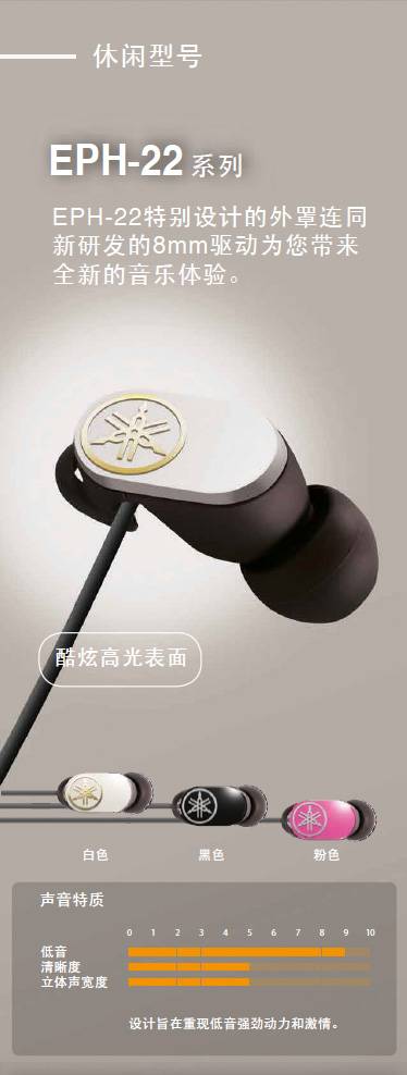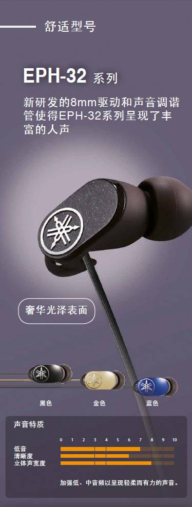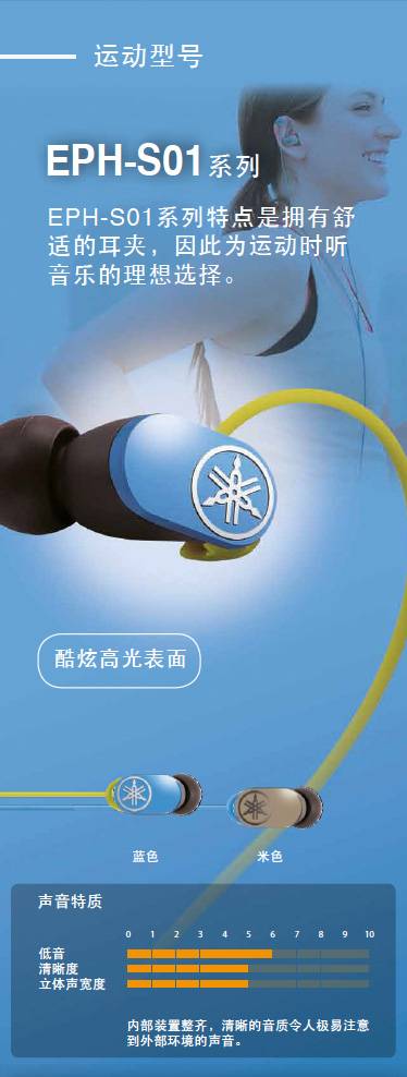 耳機讓您體會音樂之靈,滿足您的一切愿望。令您在音樂中體會美妙人生,與您相伴相隨。雅馬哈于12月推出全新EPH-S01 運動系列入耳式耳機和EPH-52/32/22舒適系列入耳式耳機,只為更好音質、更佳舒適度、更優設計感。
