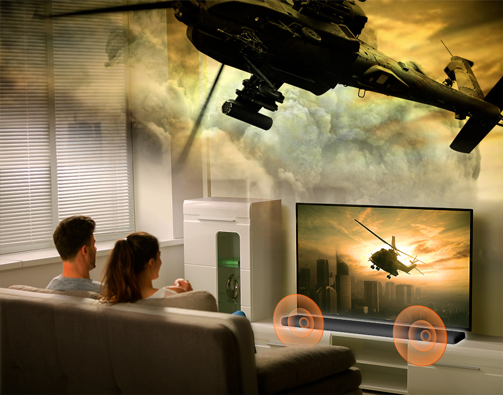 前后左右,加之以上方聲音的包圍感和臨場感。重現直升飛機從頭頂飛過的聲音以及飛向后方的移動感。在家的客廳也能體驗猶如在電影院視聽一樣的3D立體聲場。