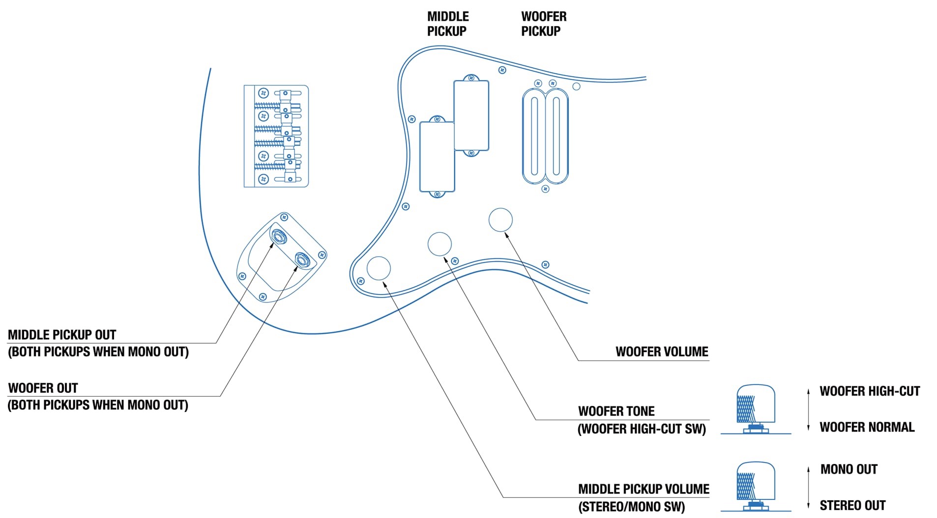 控制旋鈕 | Woofer P.U. Volume, Middle P.U. Volume with Push-Pull Stereo/Mono Switch, Woofer Tone with Woofer High Cut Switch | |