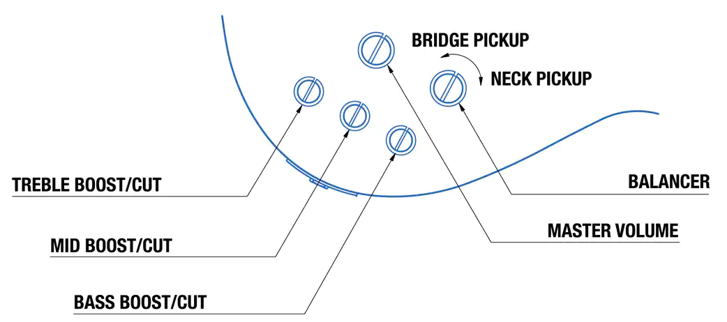 五個調(diào)節(jié)鈕的主動電路調(diào)節(jié)系統(tǒng)提供了多樣化的音色范圍。從細(xì)微的音色差異到動態(tài)范圍更大的音色輸出皆有可能。
