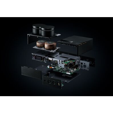 電源部分采用兩個獨立的環形變壓器,一個用于前級的信號電路,另一個用于后級的放大器部分,這種獨立的電源設計盡可能地減少了因信號相互干擾而產生的噪音。環形變壓器的使用大大降低了漏磁。此外,采用雙繞組繞線可減少電壓變化,從而提高了電源的穩定性,并通過飽滿的低頻再現達到壓倒性的空間感。